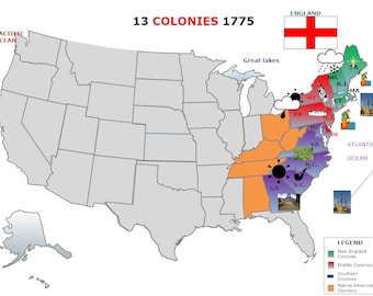 13 colonies map to color and label, although notice that they have ... Description This digital download contains the following: One page showing the labeled 13 colonies and mnemonic device ideas for memorizing them in order. There are two versions of a worksheet or assessment. These pages have a word bank with the colonies listed and the student will match the colonies with the correct numbered colony.