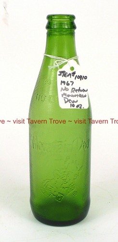 mountain dew | Antique Bottles, Glass, Jars Online Community 1967 Mountain Dew Soda Bottle- Rear View. Year Made: 1967 Glassmaker: unknown Color: green Product: Mountain Dew soda Bottler: Mountain Dew Volume: 10 fluid ounces Height: 7 3/4 inches Weight: 17.9 ounces Diameter: 2 1/8 inches Seams: 2 seams all the way to top Label Type: embossed Closure Type: pry-off metal cap. WesternPA-collector. Media item.