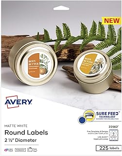 Avery 22830: Round Print-To-The Edge Labels with Surefeed, 2.5" Dia ... Avery 22830 Ideal for merchandising products, labeling gifts, crafts, party favors, jar labels, jam labels & more. Print-to-the-edge feature lets you add bright, bold colors & text all the way to the edge of the label. Permanent adhesive ensures that they stick & stay. Easy to customize with free designs & templates from Avery Design & Print.