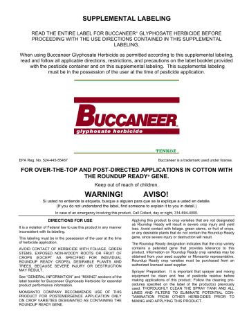PDF U.S. EPA, Pesticide Product Label, BUCCANEER PLUS GLYPHOSATE HERBICIDE ... READ THE ENTIRE LABEL FOR BUCCANEER PLUS GL YPHO . fig. i'To. . 4 {g'7-'(j HERBICIDE BEFORE PROCEEDING WITH THE USE DIRECTIONS CONTAINED IN THIS SUPPLEMENTAL LABELING. When using BUCCANEER PLUS GLYPHOSATE HERBICIDE as permitted according to this supplemental labeling, read and follow all applicable directions, restrictions, and precautions on