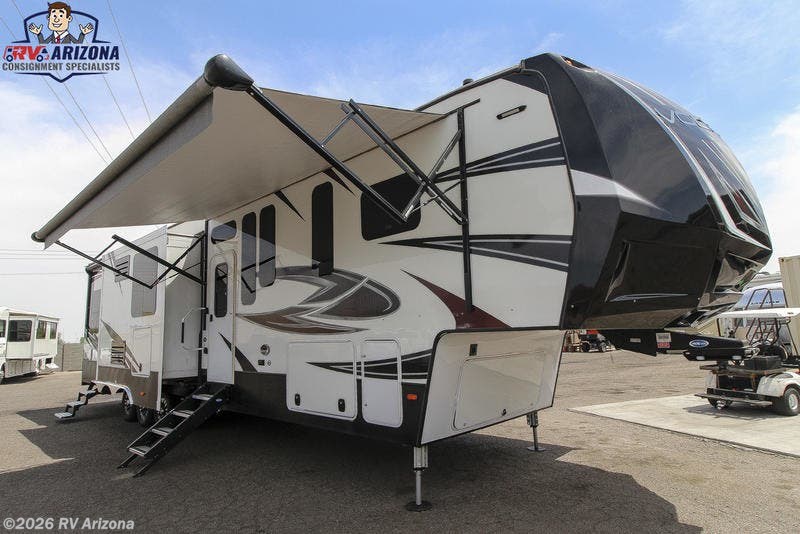 Used Fifth Wheel - 2017 Dutchmen Voltage Epic 3970 - Crossroads Trailer S Imagine your off-road toys and your family together during the races or riding the dunes. This Voltage Epic 3970 toy hauler fifth wheel will not disappoint when you need to relax after an epic day. You can sleep on a king size bed while the rest of the family sleeps on the twin bed loft, and in the garage area once the toys have been removed.