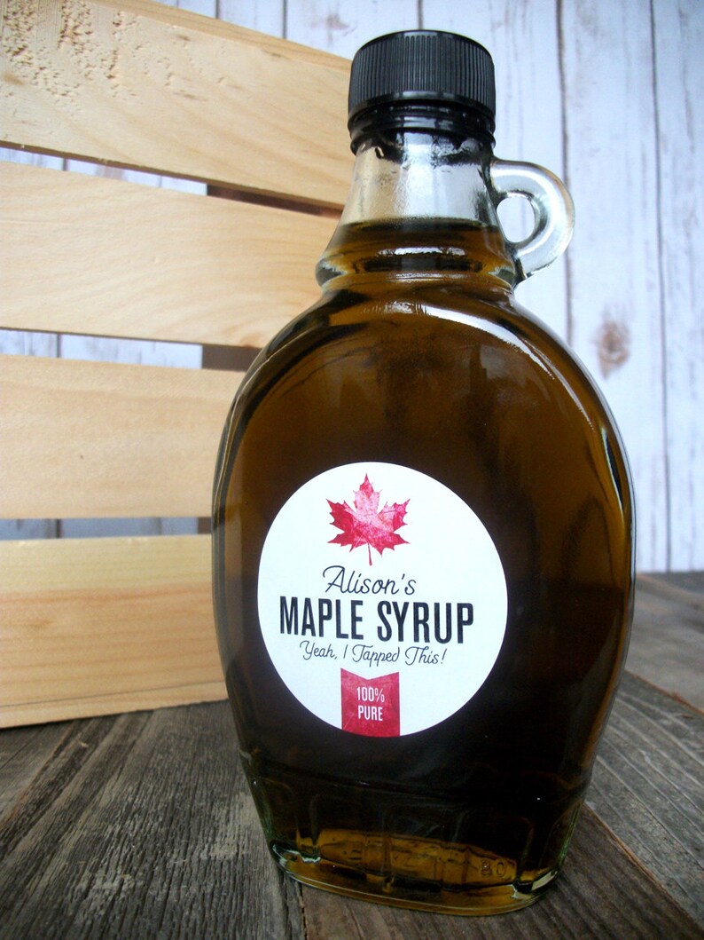 Custom maple syrup bottle & jar labels for home-based maple sugarers ... Custom maple syrup labels for home-based maple sugarers are perfect for gift giving. Our custom maple syrup labels have your name, location, syrup color & grade printed on them. Making syrup takes a lot of time, so show your syrup bottles off! Custom syrup labels are great gifts for backyard maple sugaring hobbyists.