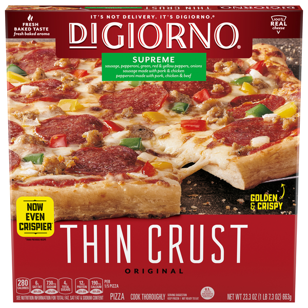 Welcome to ShopRite, your local grocery store and supermarket WebTotino's Pizza Rolls Triple Pepperoni, Pizza Snacks, 24.8 Ounce, $4.00. Totino's Pizza Rolls Triple Pepperoni Pizza Snacks, 50 count, 24.8 oz Pepperoni Seasoned Pork, Chicken and Beef Pizza Topping; Spicy & Hickory Flavored Pepperoni Seasoned Pork, Chicken and Beef Pizza Topping Pizza in a Golden Crust Frozen Pizza Dough and Frozen Bread Dough Manufactured for all Markets DeIorio's is a pizza dough supplier, manufacturing premade frozen pizza dough, dough balls, frozen bread dough, organic dough and more for over 9 decades. ... Food Safety & Standards Our customers health is our number one priority and we are committed to their safety… More. Private Labeling Grow your Business: Private Labeling with ... DiGiorno Nutrition Facts. Calories, carbs, fat, sodium & more ... 49 items DiGiorno spinach raw peppers brown rice spinach avocado whole wheat bread slice cheese slice chicken oz American cheese slice Quaker oats oatmeal coffee caffeinated sweet peppers grapes coffee cup Kraft cheese slice Kraft American cheese singles olives shredded sharp cheddar onion red seedless grape non fat milk cookie tomato fresh Digiorno Pepperoni Frozen Pizza with Original Thin Crust It's DIGIORNO. Preparation instructions 1. Preheat & bake at 400°F. Keep pizza frozen while preheating. 2. Remove film from pizza. 3. Place pizza directly on center oven rack. 4. Bake 16 minutes. 5. Pizza must be cooked thoroughly to 165°F for food safety & quality. Do not allow pizza to thaw. Do not eat pizza without cooking.
