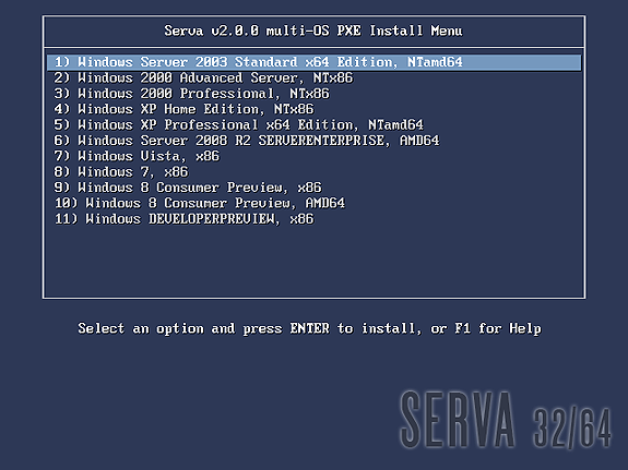 Serva PXE/BINL - AN01.2: RIS OSs Windows Network Install - Vercot Fig 1: Serva Multi-OS PXE Boot/Install EFI64/BIOS/EFI32 Menus The Fig 1 shows the menu that a generic PXE client, depending on its pre-boot environment, will display as soon as it boots-up. From this point we just select the desired OS and hit [Enter] to install it from the net.